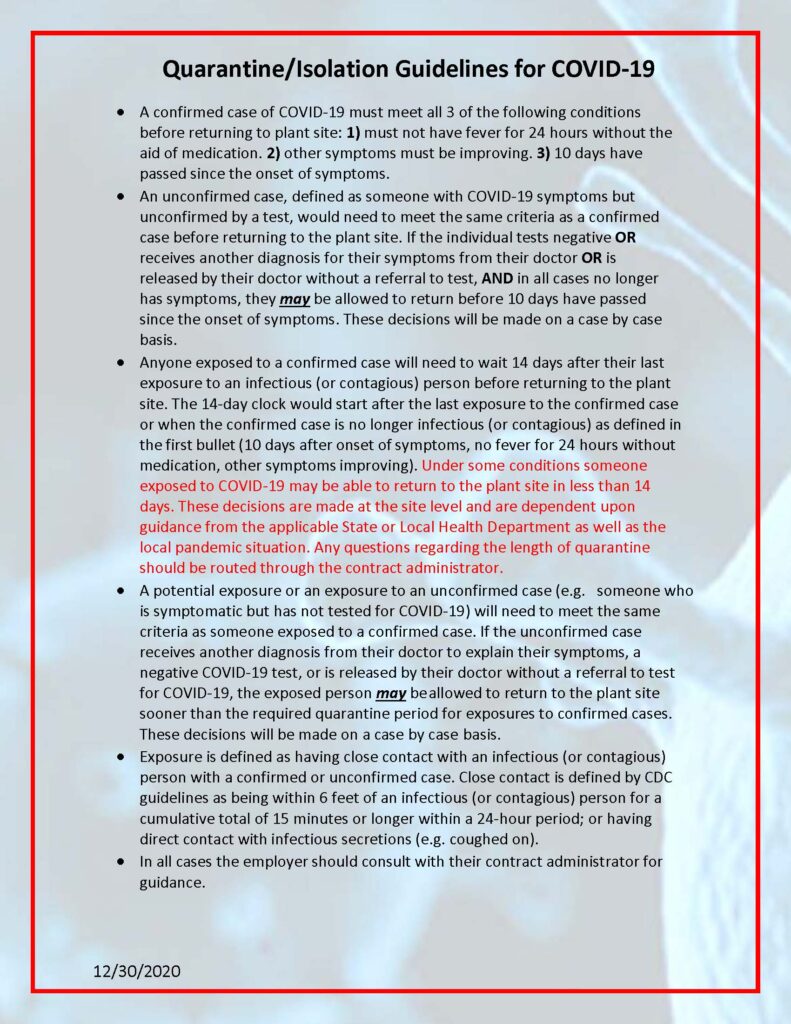 Southern Company released the following COVID-19 quarantine/isolation guidelines on Dec. 30. Any member working at a Southern Company facility or considering employment at a Southern Company site should be aware of these guidelines.