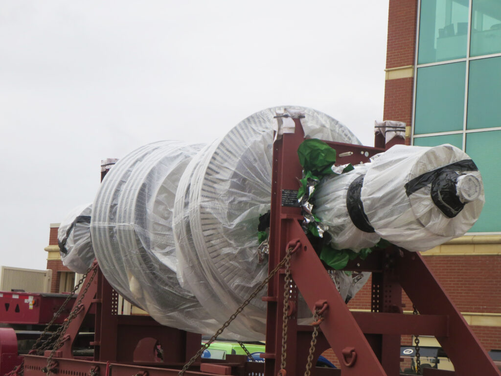While conducting their routine inspection of parts and components, millwrights identified a five-foot-tall stud that needed to be replaced due to cracks and bad threads, Wilson said. “It was one of the studs that holds the entire shell together,” she said. “When you set the hood down, the guide bolts and the studs make sure the entire shell sits in place correctly and the hood goes back on safely.”