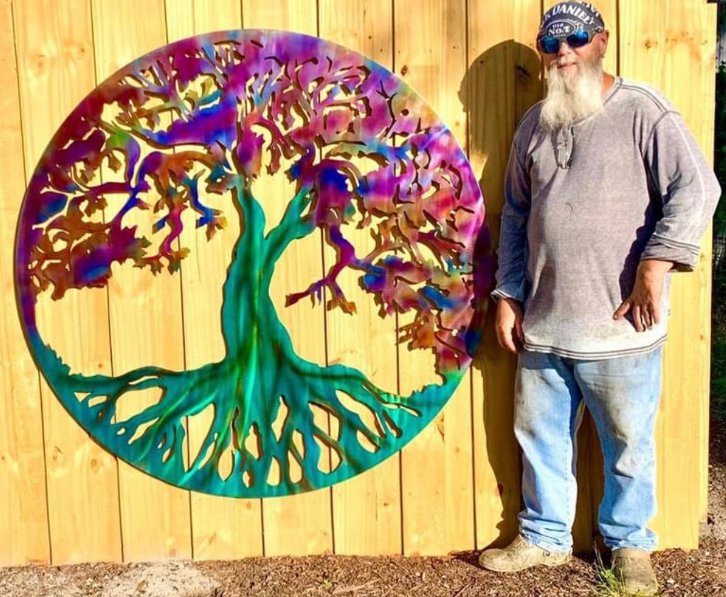 Ed Bartles wih a custom piece of metal artwork he and Matt made