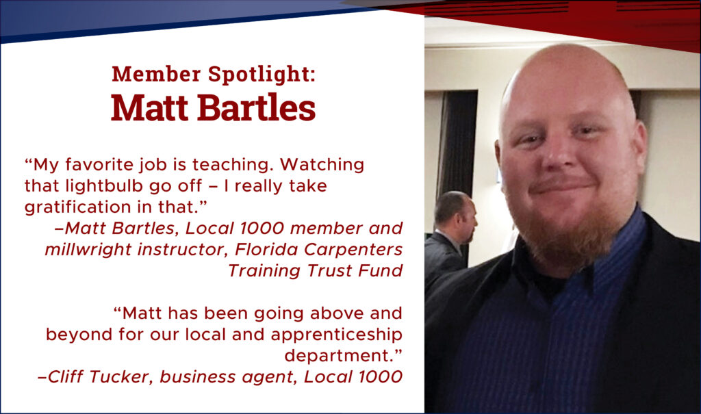 Bartles holds leadership positions with the union and is continuing his education. He is the recording secretary for Local 1000 and is in his second term as a delegate to the Southern States millwrights Regional Council.