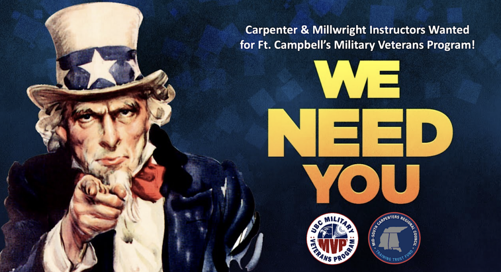 The Mid-South Carpenters Regional Council Training Trust Fund is considering hiring one full-time instructor and one part-time instructor to deliver carpenter and millwright craft training through the United Brotherhood of Carpenters’ Military Veterans Program at the Army base in Fort Campbell, Kentucky. Wages will be approximately $36.74 per hour.