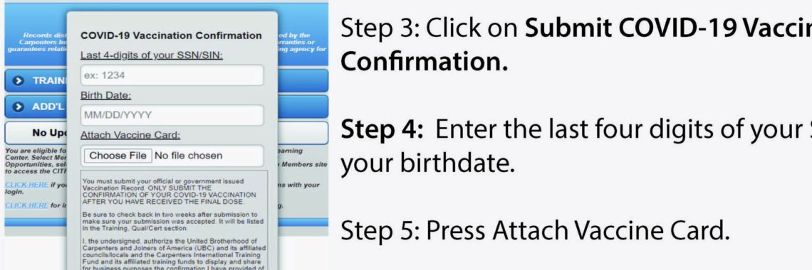 To meet the demands of contractors, the UBC has launched an online portal to upload proof of COVID-19 vaccination through Training Verication Cards. The portal can be accessed through the UBC Mobile App or from your TVC Card.
