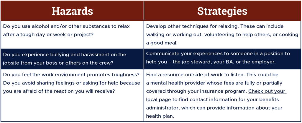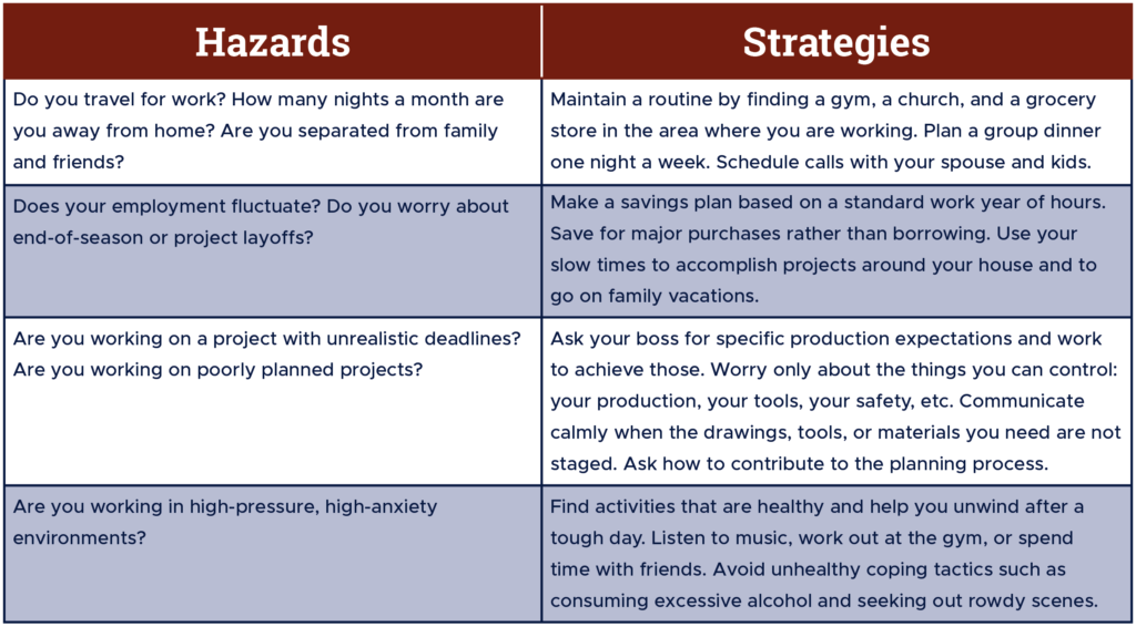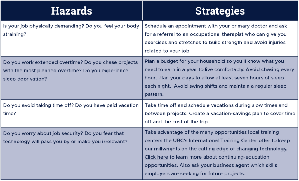 While the bravado of the construction industry and other industries we work in as millwrights has been glamorized and made a thing of legends, the truth behind the images and stories paints a much different picture. The stress of physically demanding work, unrealistic deadlines, and impossible goals strains our mental well-being. Months away from home, separated from family and friends, working long hours and weekends chasing a paycheck, isolates us from the people in life who balance us. Years on the road, without exercise and healthy diets, avoiding doctors, and working without vacations, take a toll.